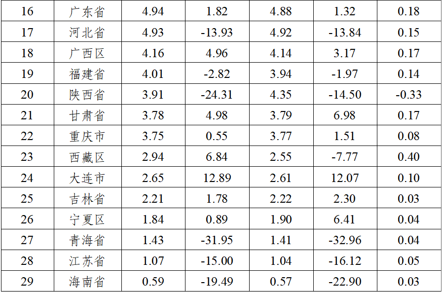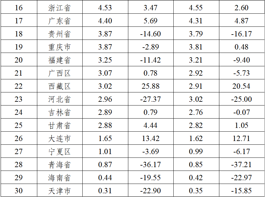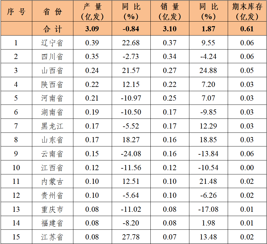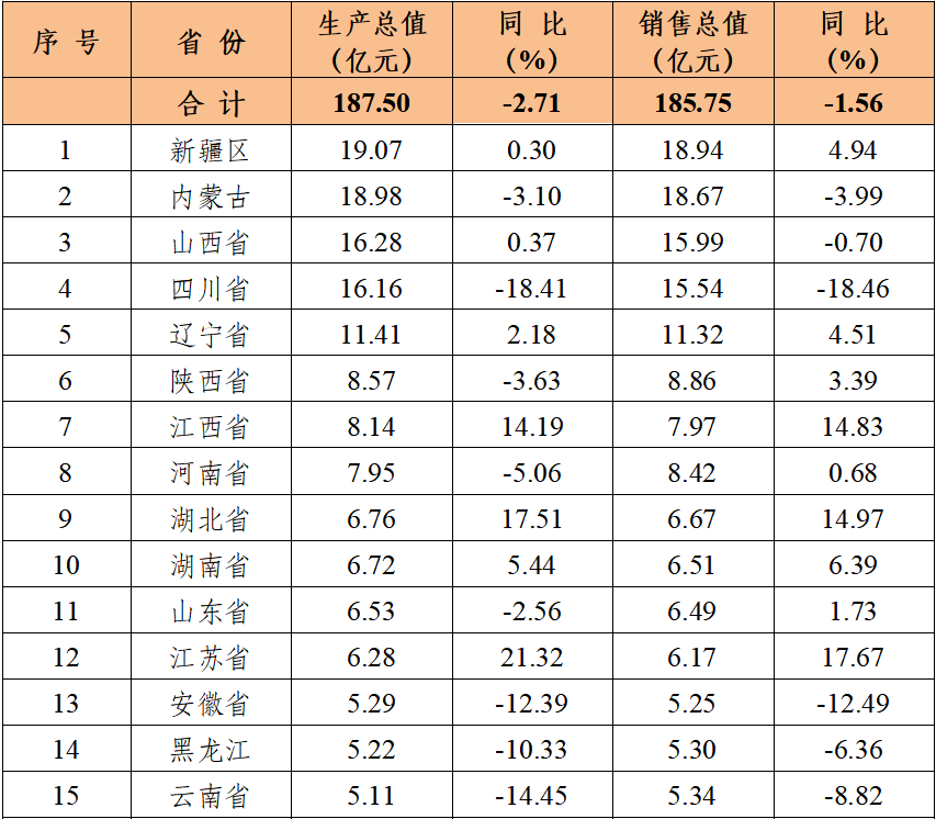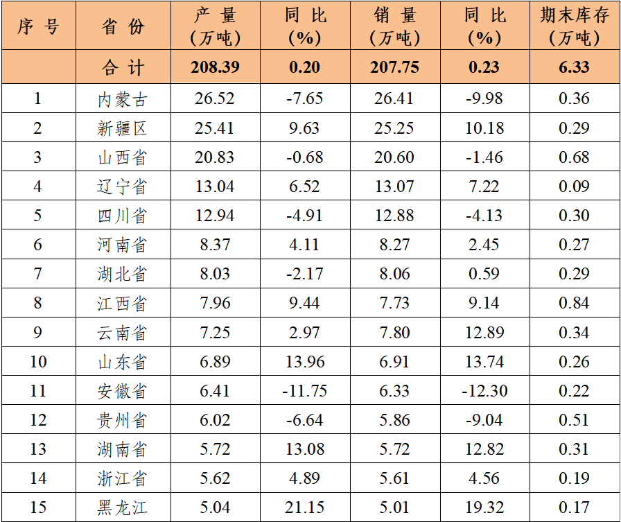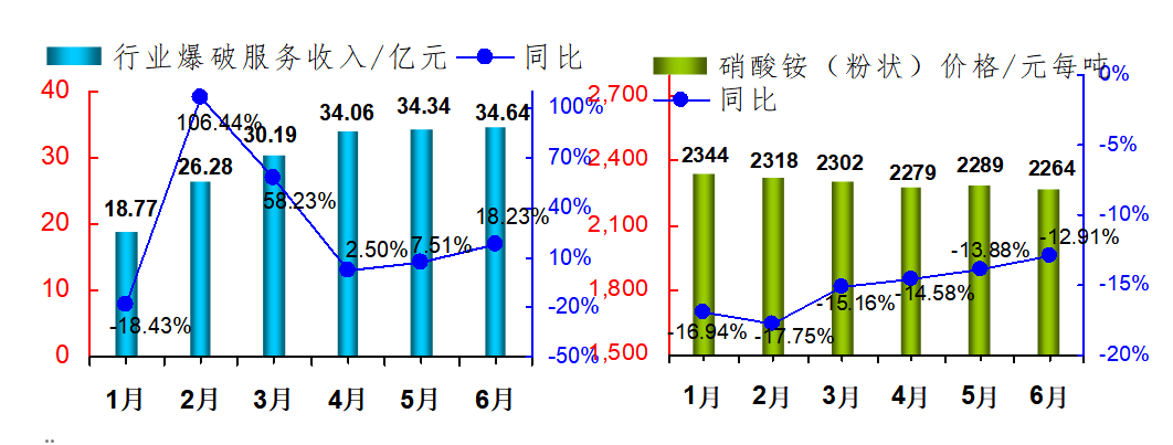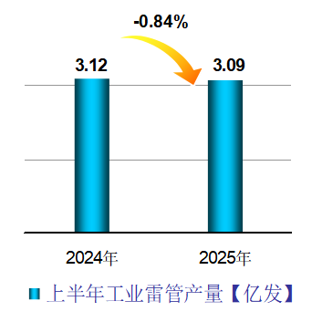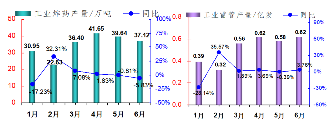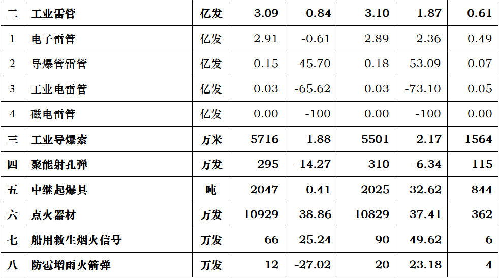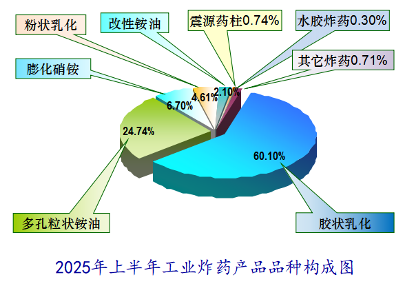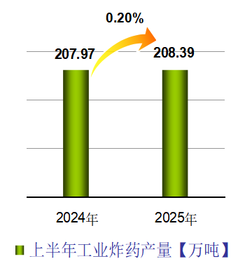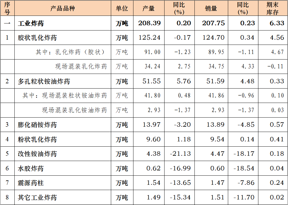 2025年上半年,民爆行业总体运行情况平稳可控,炸药产量与去年同期基本持平。因市场竞争加剧,产销总值同比呈下降趋势。 1、生产企业情况 上半年,生产企业累计完成生产总值187.50亿元,同比下降2.71%;累计完成销售总值185.75亿元,同比下降1.56%。 上半年,生产企业累计实现主营业务收入200.67亿元,同比下降1.49%;累计实现利税总额57.12亿元,同比下降3.03%;累计实现利润总额44.37亿元,同比下降4.07%;累计实现爆破服务收入172.72亿元,同比增长18.29%。 上半年,生产企业从业人员劳动报酬额累计完成29.93亿元,同比增长11.01%;从业人员人均报酬实现9700元/月,比2024年上半年人均报酬增长15.48%。 上半年,生产企业累计投入安全资金3.75亿元,同比增长5.14%;累计投入新产品试制及科研费用4.94亿元,同比下降10.48%。 2、销售企业情况 上半年,销售企业累计完成民爆产品购进总值65.45亿元,同比下降14.65%;累计完成民爆产品销售总值79.23亿元,同比下降13.81%。 上半年,销售企业累计实现销售收入89.97亿元,同比下降16.84%;累计实现利税总额6.52亿元,同比下降21.34%;累计实现利润总额3.79亿元,同比下降32.05%;累计实现爆破服务收入5.56亿元,同比增长9.01%。 上半年,销售企业从业人员劳动报酬额完成5.81亿元,同比下降26.04%;从业人员人均报酬实现5800元/月,比2024年同期下降10.77%。 上半年,销售企业安全投入完成3.79亿元,同比增长31.83%。 3、主材价格 截止至6月末,粉状硝酸铵价格为2264元/吨,同比下降12.91%,环比下降1.09%;多孔粒状硝酸铵价格为2396元/吨,同比下降9.81%,环比上升1.57%;液态硝酸铵价格为2109元/吨,同比下降13.90%,环比下降0.80%。 二、主要民爆产品完成情况 1、主要产品产、销、存情况 上半年,生产企业工业炸药累计产、销量分别为208.39万吨和207.75万吨,同比分别增加0.20%和0.23%。上半年,现场混装炸药产量累计完成78.97万吨,同比增加1.50%。 上半年,生产企业工业雷管累计产、销量分别为3.09亿发和3.10亿发,同比分别减少0.84%和增加1.87%。 从库存量上看,2025年6月末,生产企业工业炸药库存总量为6.33万吨,同比减少11.22%;工业雷管库存总量为0.61亿发,同比增加3.39%。(2025年上半年民爆产品主要品种产销存情况详见附表1) 上半年,销售企业累计购进、销售工业炸药65.44万吨和65.37万吨,同比分别减少7.06%和5.03%;累计购进、销售工业雷管1.46亿发和1.51亿发,同比分别减少4.43%和4.05%;期末工业炸药库存量为2.57万吨,同比减少38.22%,期末工业雷管库存量0.24亿发,同比减少29.41%。 2、主要产品品种产量同比变化情况 从工业炸药主要品种产量变化情况看,上半年,胶状乳化炸药累计产量为125.24万吨,同比减少0.17%;胶状乳化炸药产量占工业炸药总产量的60.10%,所占比例比2024年同期缩小0.3个百分点。多孔粒状铵油炸药累计产量为51.55万吨,同比增加5.76%;多孔粒状铵油炸药产量占工业炸药总产量的24.74%,所占比例比2024年同期扩大1.3个百分点。 上半年,粉状炸药总产量为27.95万吨,同比减少4.12%。其中:膨化硝铵炸药累计生产13.97万吨,同比减少3.20%,膨化硝铵炸药产量占工业炸药总产量的比例为6.70%;粉状乳化炸药累计生产9.60万吨,同比增加1.18%,粉状乳化炸药产量占比为4.61%;改性铵油炸药累计生产4.38万吨,同比减少21.13%,改性铵油炸药产量占比为2.10%。(2025年上半年工业炸药各品种产量和所占比例情况详见上图) 从工业雷管品种产量看,上半年,电子雷管产量为2.91亿发,同比减少0.61%,电子雷管占工业雷管总产量的93.99%,所占比例比2024年同期扩大0.4个百分点;导爆管雷管累计产量为0.15亿发,同比增加45.70%,导爆管雷管产量约占雷管总产量的5.00%,所占比例比2024年同期扩大0.04个百分点;工业电雷管产量为0.03亿发,同比减少65.62%,工业电雷管产量约占雷管总产量的1.01%,所占比例比2024年同期降低1.9个百分点;2025年上半年无磁电雷管生产。(2025年上半年工业雷管品种构成情况详见下图) 三、工业炸药、工业雷管产量地区分布情况 1、工业炸药 2025年上半年,全国共17个地区工业炸药累计产量同比呈正增长趋势,其中增幅超过10%的地区有黑龙江、山东、河南和大连;其余12个省份有不同程度下降,其中降幅超过15%的省份有青海、陕西、海南和江苏。 从总量上看,上半年有5个地区工业炸药累计产量超过12万吨,分别是内蒙、新疆、山西、辽宁和四川,其中内蒙今年上半年工业炸药累计产量近27万吨,约占行业总产量的13%,继续保持行业第一。 2、工业雷管 2025年上半年,工业雷管累计产量同比呈正增长的地区有9个,其中增幅超过20%的地区有江苏、辽宁和山西;其余16个地区均有不同程度下降,其中降幅超过15%的省份有新疆、云南和天津。2025年上半年工业雷管累计产量有5个省份超过0.2亿发,分别是辽宁、四川、山西、陕西和河南。 四、附图/附表1-4 附图:主要指标月度完成情况分布图 附表1 2025年上半年民爆产品主要品种产销存汇总表 附表2 2025年上半年生产销售总值排序表 附表3 2025年上半年工业炸药产销存总量排序表 附表4 2025年上半年工业雷管产销存总量排序表